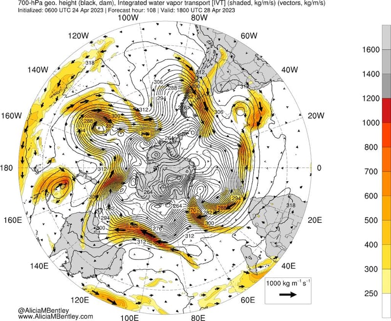 Mientras el modelo europeo estima sobre 60 milímetros de agua el fin de semana, el americano solo se aproxima a 30 mm. La lluvia comenzaría el viernes debido a un río atmosférico de categoría 3 a 4.