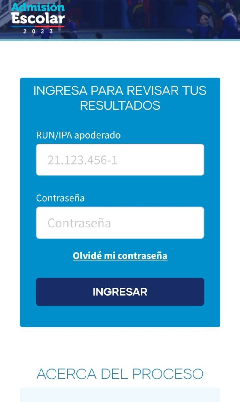 Para realizar la consulta, el sitio pedirá ingresar el RUN o IPA del apoderado y la contraseña utilizada al postular.
