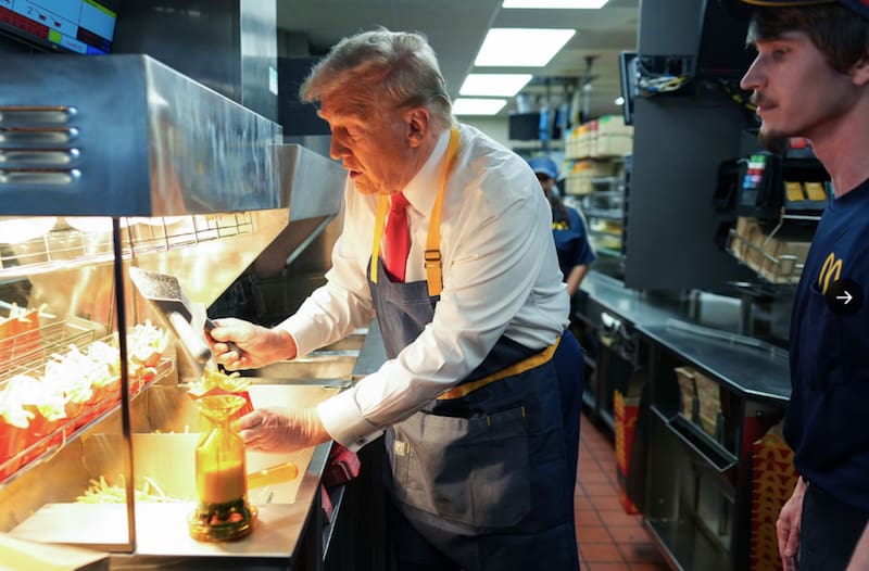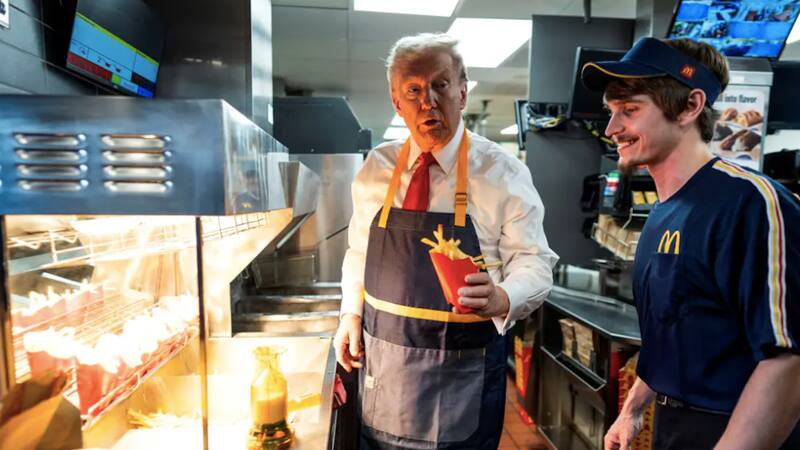 Trump, que en distintas ocasiones ha confesado su afición por la comida rápida, usó un delantal con tiras doradas para proteger su camisa blanca y su corbata roja, combinando con los colores de la famosa cadena de comida rápida. Después de que le enseñaran a hacer papas fritas, el expresidente se puso a freír, ponerles sal y guardarlas en sus paquetes.